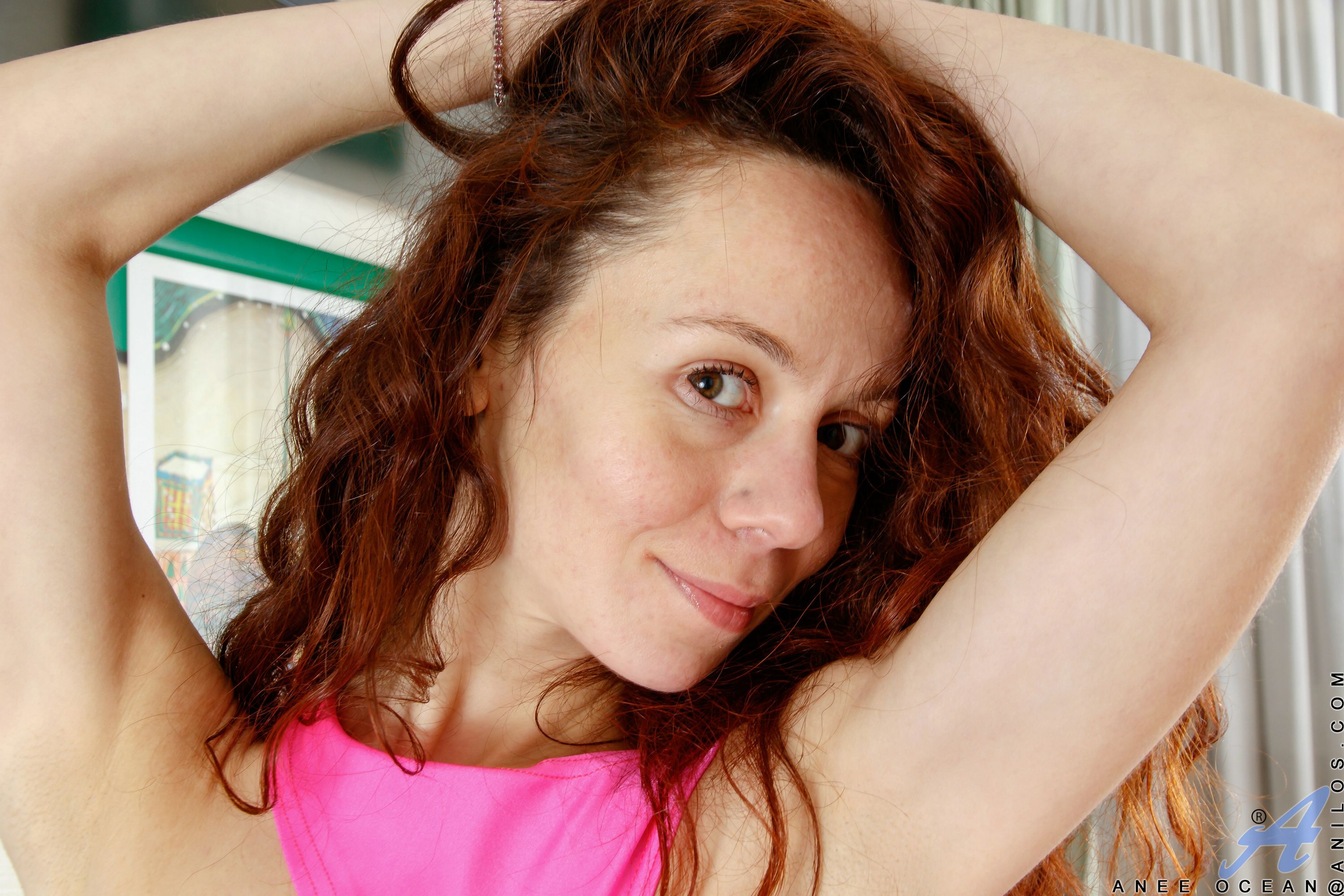 Anee Ocean in pink stockings showing off bald twat