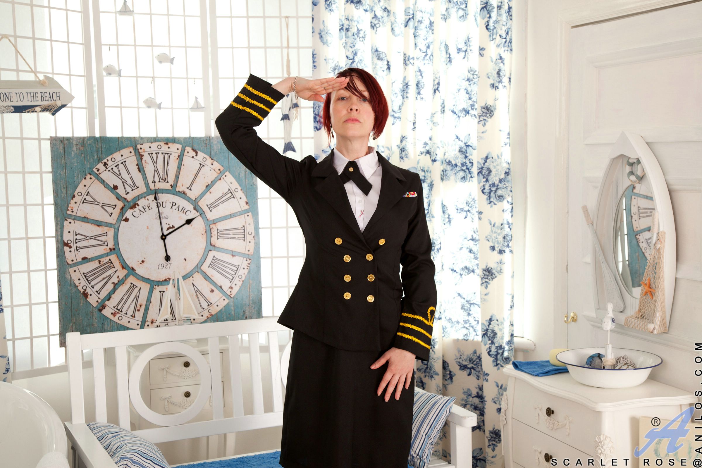 Scarlet Rose strips and off her uniform and spreads wet cunt