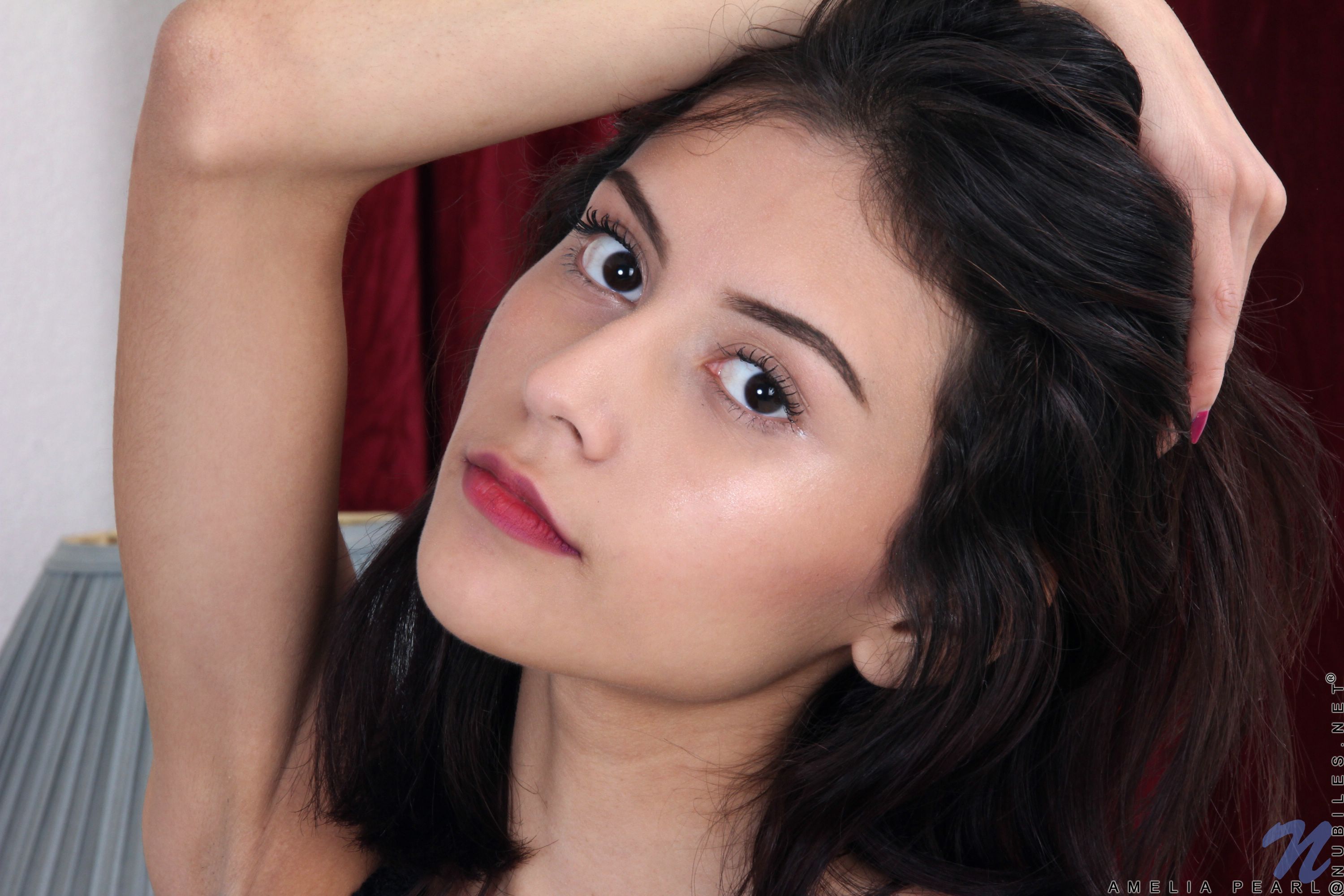 Amelia Pearl in red high heels teasing and playing with a dildo